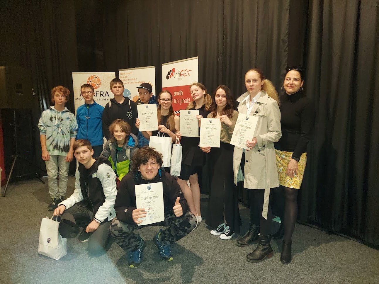 Všem soutěžícím a zároveň i oceněným gratulujeme a děkujeme za skvělou reprezentaci školy! Rovněž děkujeme žákům 7.A, kteří na soutěži pravidelně vystupují a pomáhají s přípravami a realizací soutěže. Velmi si vážíme práce našich žáků a do budoucna jim přejeme další školní i životní úspěchy. http://2023.antifetfest.cz/
