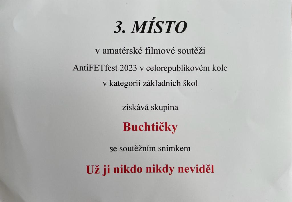 Žákyně 8. A Timea R. a Lucie H. získaly krásné umístění v celostátním kole soutěže Antifetfest. Soutěžily se snímkem “Už ji nikdy nikdo neviděl”. Tento film rovněž postoupil v obvodním a celopražském soutěžním kole. Celostátní kolo se konalo ve dnech 3. a 4. 10. 2023 v Lomnici nad Popelkou a naše děvčata v něm získala krásné 3. místo, k němuž jim srdečně gratulujeme a rovněž děkujeme za skvělou reprezentaci školy!