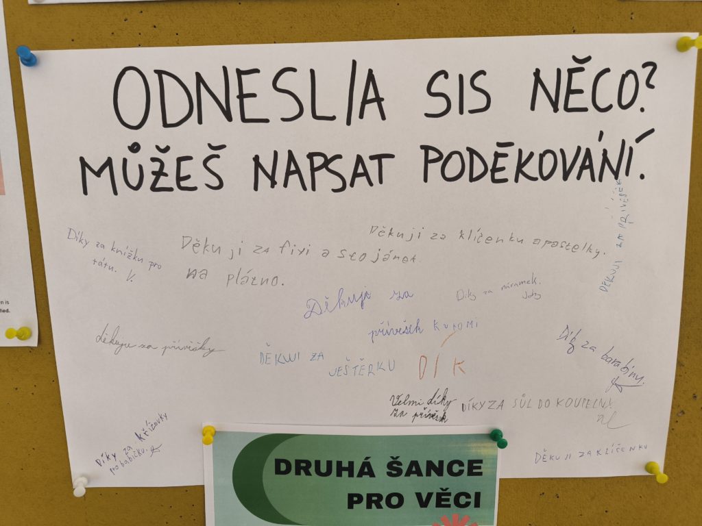 Na tuto lavici můžete také přinést své věci, které už nepoužíváte, a nabídnout je ostatním. Díky tomu není potřeba vyrábět tolik nových výrobků, vzniká méně odpadu a spotřebuje se méně surovin i energie.