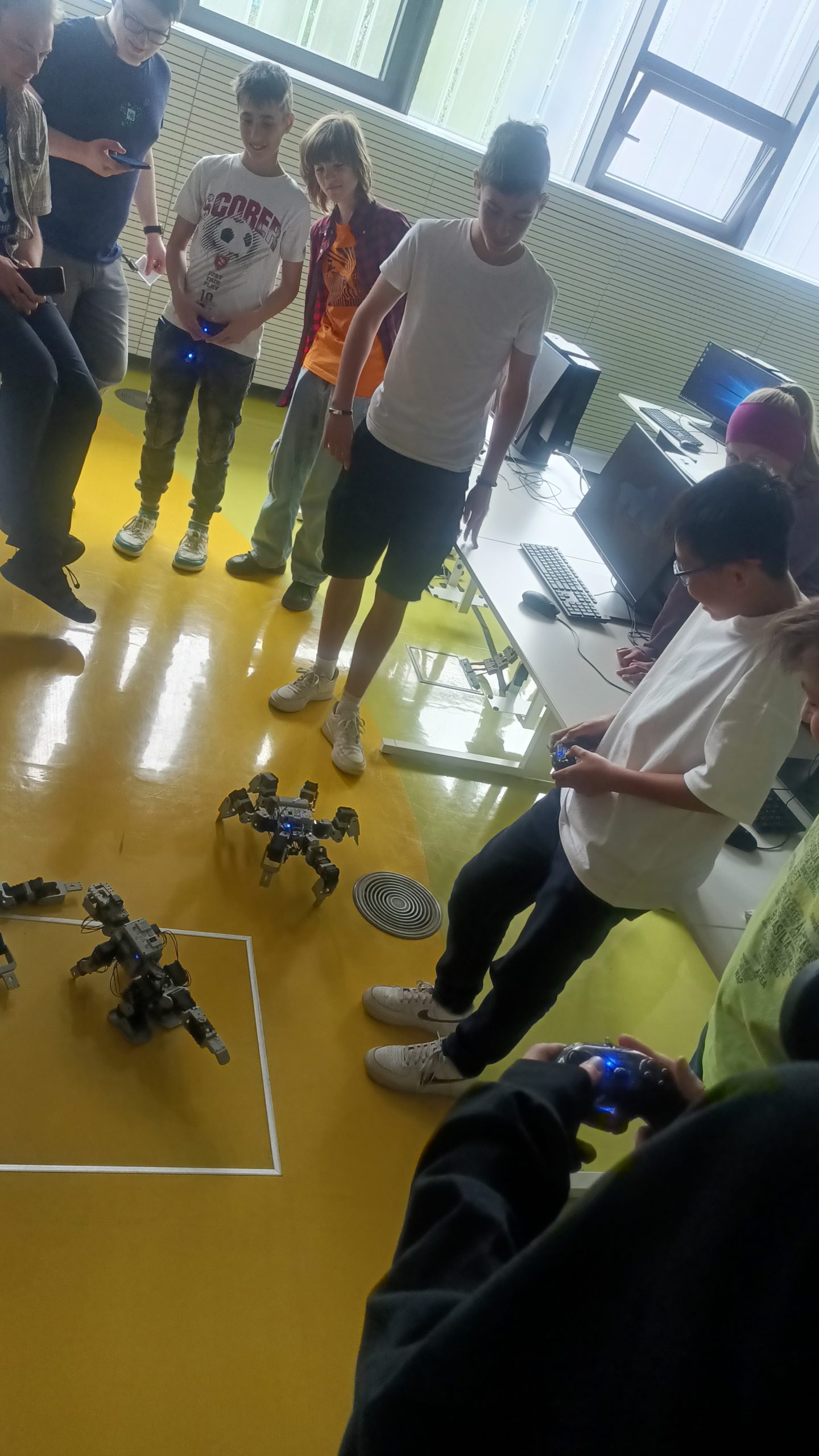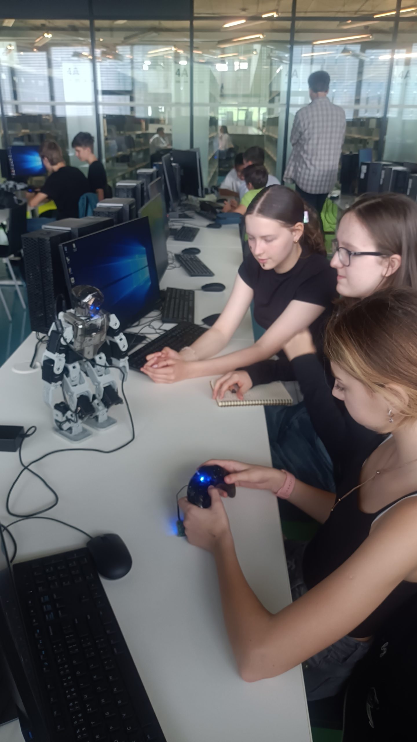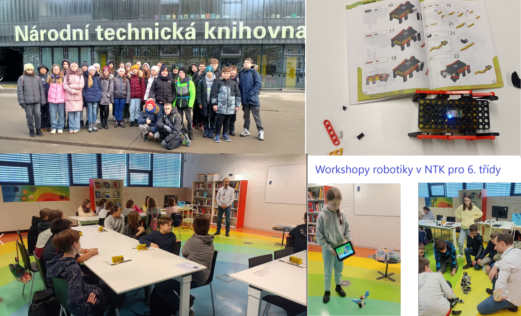 Po skupinách žáci nejprve zkoumali, jak robot funguje (např. robotický štír, pavouk, člověk), pak se pokusili ho naprogramovat a naučit ho něco nového a nakonec vždy 2 týmy předvedli s roboty nějaké představení. Žáky práce s roboty velmi zaujala, velmi děkujeme lektorům i vedoucímu v NTK za možnost se s roboty seznámit a vyzkoušet si práci s nimi.