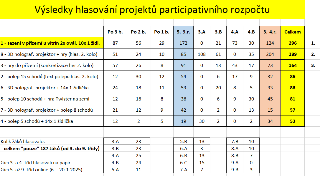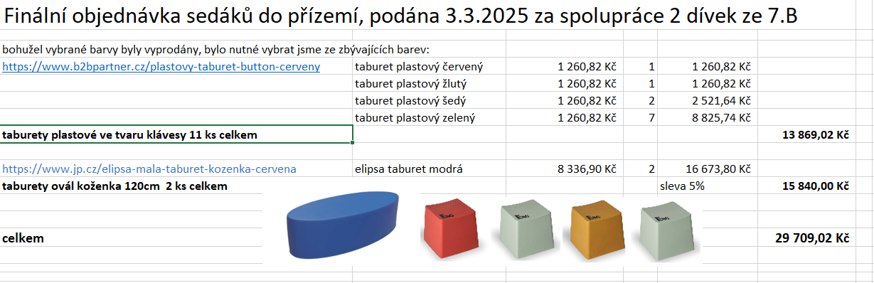 Dne 3.3.2025 byla za spolupráce 2 žákyň 7.B. odeslána kompletní objednávka a participativní rozpočet je tak ukončen.