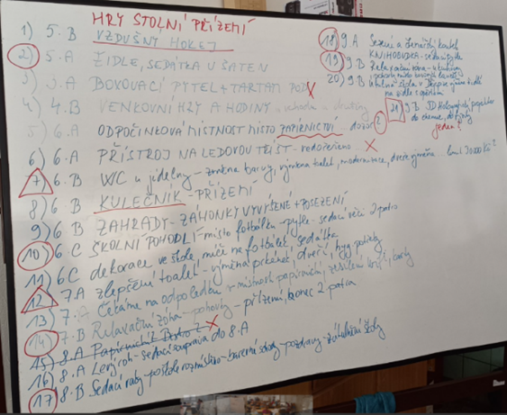 - 5.12.2024 5. vyuč. hodina – schůzka žákovského parlamentu i se zástupci 4. – 9. tříd s prezentací projektů – navrženo 21 projektů, z nichž některé byly žákovským parlamentem vyřazeny pro nedostatečné informace nebo sloučeny do jednoho návrhu k hlasování