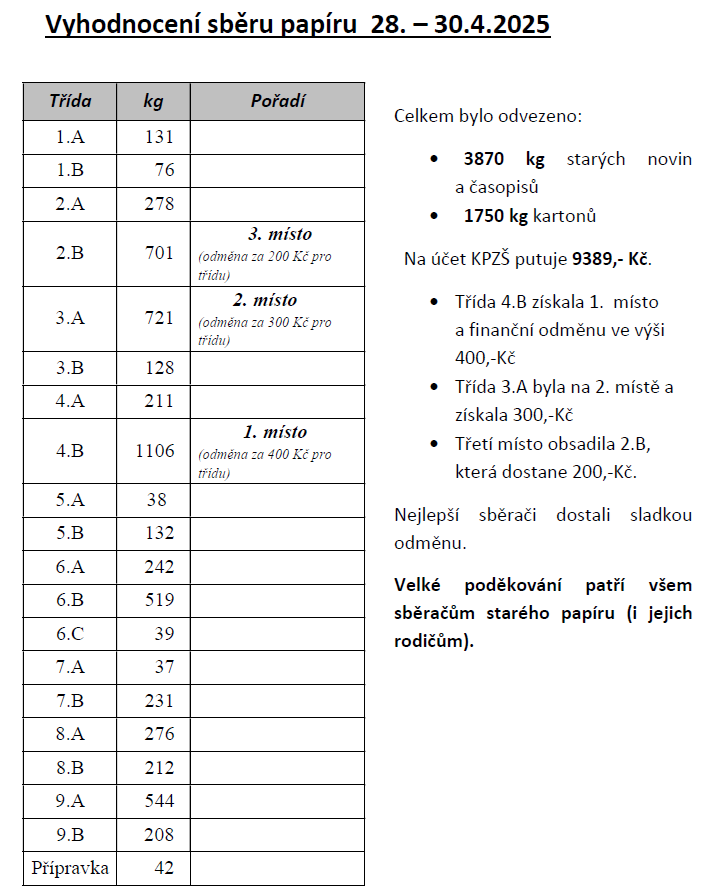 Vyhodnocení sběru papíru 28. – 30.4.2025