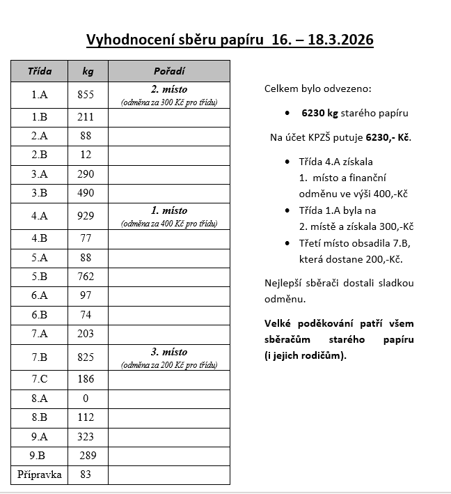 Vyhodnocení sběru papíru 16. – 18.3.2026